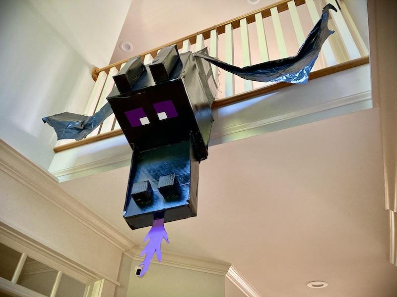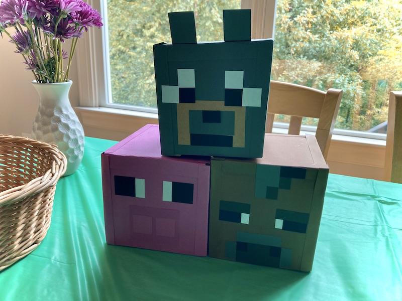 My main focus is to not spend a lot of money and buy things that are reusable. My son’s last birthday party was a Minecraft themed party. We had just moved so I had a lot of cardboard boxes that I used to make things like block animals and creepers. I even wrapped our cooler of drinks in a cardboard box so it looked like a Minecraft chest. My son then requested I make an Ender dragon which became quite the challenge but one I wanted to take on. What do you think? I think it turned out pretty well!